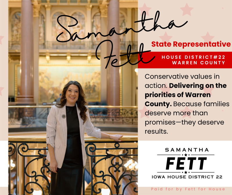 By providing your cell phone number, you are consenting to receive recurring automated text messages & automated calls from the Fett for Iowa House Campaign with news, updates, and information about the campaign and related issues. Message frequency will vary. Message and data rates may apply. Text HELP for more information. Text STOP to stop receiving messages. Privacy policy and SMS terms available at: (Privacy Policy below)